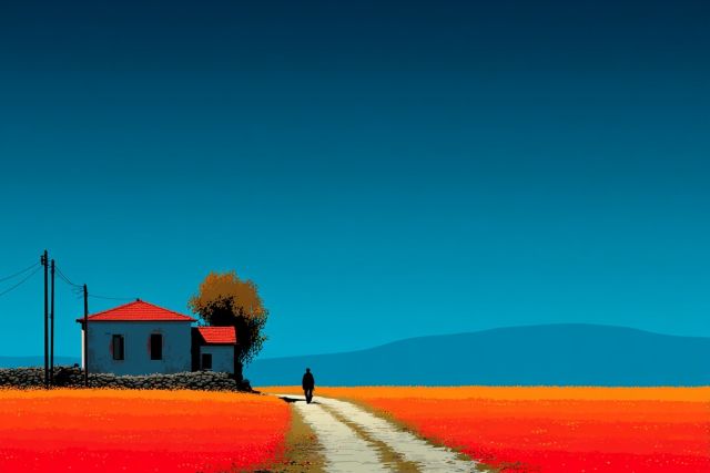 Bathed in luminous shades of fiery orange and deep blue, this striking artwork captures the essence of a serene yet dramatic landscape. A solitary figure, small and contemplative, walks away on a narrow path that cuts through a vivid field of orange blossoms. The richness of the orange hue contrasts starkly against the tranquil azure sky and the misty blue mountains looming in the distance, giving a sense of infinite depth and possibility. To the side stands a quaint, solitary house, surrounded by a touch of greenery and hints of autumnal gold in the trees suggesting a change in seasons, or perhaps, a change in life. The stark simplicity of the composition paired with the boldness of the colors crafts a narrative of solitude, introspection, and an undying quest for meaning in expansive spaces that beg the viewer to pause and reflect. The painting invites one to step into a world where color sings, boundaries blur, and the everyday transforms into the extraordinary. This captivating portrayal of color and solitude serves not only as a visual feast but also as an invitation to explore the deeper silences places hold within them.