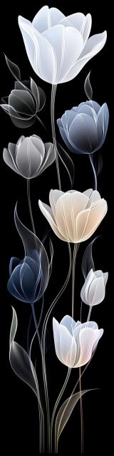 Envelop your senses with the delicate allure of 'Serenity in Bloom', an elegant portrayal of floral beauty set against a deep, mysterious backdrop. The artwork features a cascade of tulip blossoms, each rendered in a distinct hue of white, black, and shades of slate blue, emerging with grace from the shadowy abyss. The petals, smooth and almost translucent, appear ethereal under an unseen light source that breathes life into this darkened space. This piece masterfully plays with contrast; the vibrancy of the pale flowers starkly juxtaposed against the dark background evokes a feeling of both isolation and intimacy. As your eyes travel along the vertical garden, flowers seem to float, untethered, in an infinite night sky, suggesting themes of tranquility and the fleeting nature of beauty. Perfect for anyone seeking to add a touch of understated elegance, this print invites viewers to pause and reflect, making it more than just a visual pleasure but a conduit for personal retreat and contemplation.