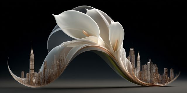 In a breathtaking blend of natural elegance and urban architecture, a large white flower unfurls its petals to reveal a miniature cityscape intricately woven into its core. The petal folds mimic soft, fluid waves that seamlessly transition into the hard, angular lines of iconic skyscrapers. This exquisite artwork captures the spirit of two contrasting realms. The luminous, almost translucent quality of the flower's petals enhances the warm, golden hues of the city lights that seem to glow from within. The dark, moody background creates a striking contrast, spotlighting the composition and casting a mystical allure over the whole scene. Capturing the delicate balance between organic growth and human engineering, this piece speaks to the heart of viewers who find beauty in the integration of natural elements with human creativity. The artistic manipulation encourages a deep reflection on the relationship between man-made environments and natural forms, highlighting a harmonious coexistence that inspires awe and wonder.