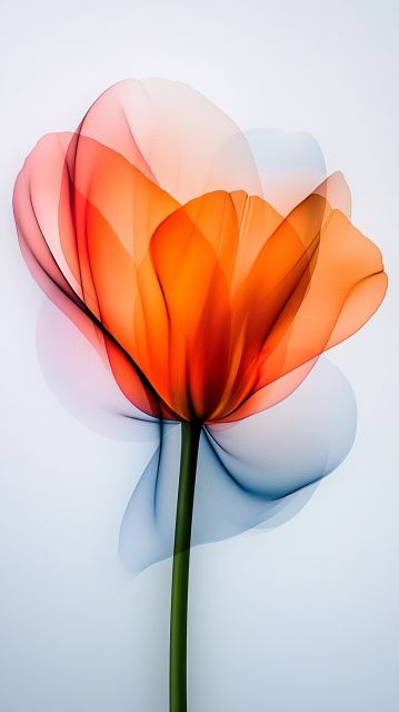 Unveil a realm where artistry and nature embrace in a dance of colors and light with the "Translucent Elegance" print. The artwork features a solitary flower, rendered with such delicate precision that each petal seems to glow from within. This ethereal beauty stands boldly, with petals that transition from a soft cerulean at the base, through a spectrum of vivid oranges, to a fiery crimson at the tips, mirroring the fleeting yet intense blaze of a sunset.
