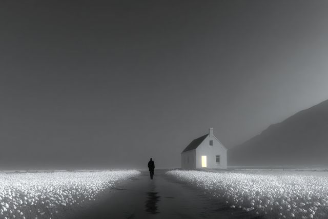 Solitary Journey: A Mystic Walk Towards the Illuminated Cottage