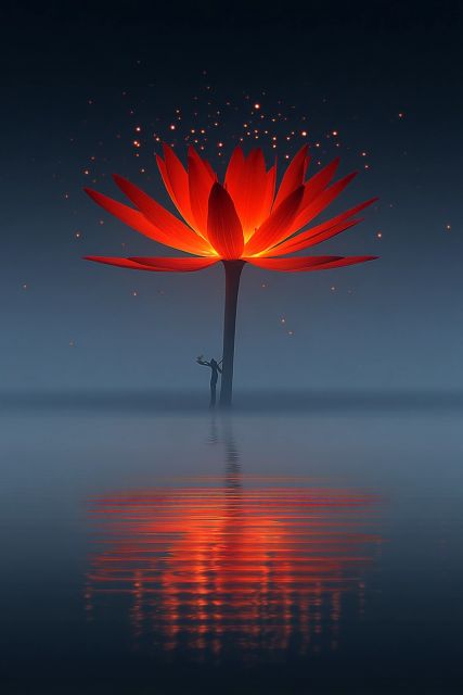 Bathed in the mystique of twilight, an otherworldly lotus flower emanates an ethereal glow, its fiery red petals unfurling against a serene, indigo sky. This striking image captures a moment of pure wonder, where light and shadow dance gracefully over a placid body of water. Enigmatic sparks flutter softly around the flower, each a tiny beacon of life and mysticism, enhancing the image's magical allure.