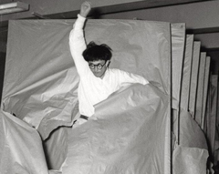Saburo Marakami's piece At One Moment, Opening Six Holes at the first Gutai Group exhibit, 1955