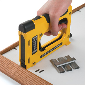A Point Gun (also called a Point Driver, Tab Gun or Tab Driver) looks and works like a heavy duty staple gun, but instead of staples, it fires small metal rods into the wooden picture frame. Once inserted, these pins can be bent back, allowing you to change the artwork. This method also works well for mounting work permanently.