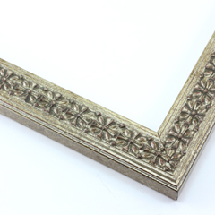 This slim, ornamented design features bevelled inner and outer edges and a celtic cross pattern in relief The solid wood frame is covered in a gold-brushed silver foil. A faint red patina gives it an antiqued look.
