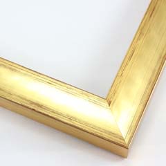This glossy gold frame has a subtle scoop face with bronze distressed scratching on the outer edges. The drop edge is the same gold-foil as the face.