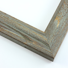 This simple frame is covered with a matte grey wash that highlights the natural wood grain.  An antique look is created with a gold patina.