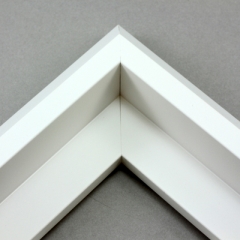 This unique floater frame for stretched canvas features a narrow, 0.5 " face that falls into a steep reverse slant toward the outer edge of the frame.  The modern style is finished in matte white.